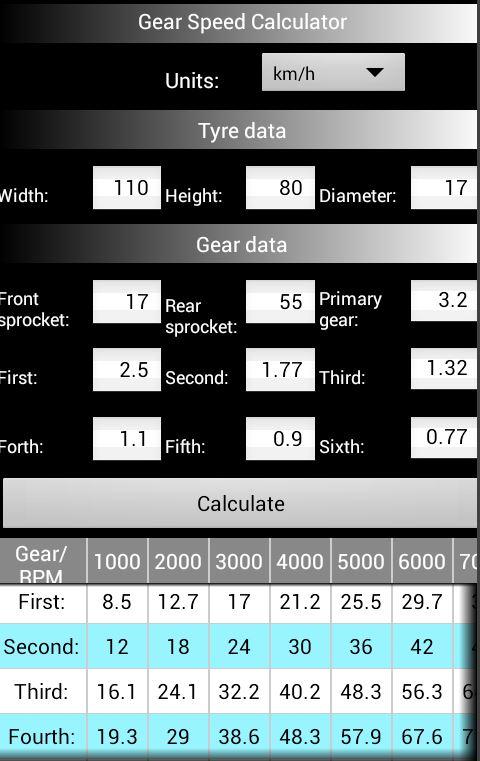 它也可根據您的傳動裝置和車輪尺寸(槓桿計算器)速度計算器。它輸出在KM或MPH速度在2D表中相對於所述RPM(最大15000RPM)。您也可以保存多達4自行車的傳動裝置的設置。