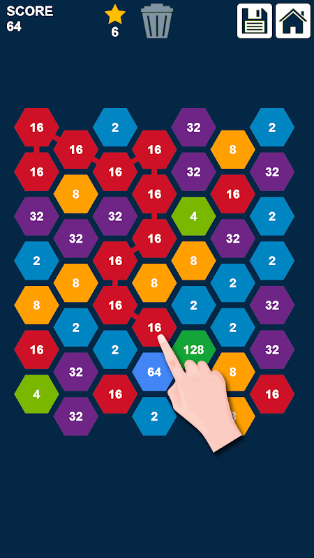 2048個六角形拼圖:連接和合併數字是一個三消遊戲。只需連接3個或更多相同的六角形數字,然後它們將被合併,以便將它們的總和轉換為序列中最接近的數字[2、4、8、16、32,...,1024、2048,...] 。數字是數字2的重複乘法。