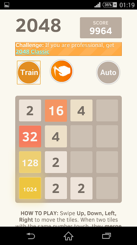 Swipe (Up, Down, Left, Right) to move the tiles. When two squares with the same number touch they merge into a one tile or a larger number (2 + 2 = 4, 4 + 4 = 8, and so on). When 2048 tile is created, the player wins!