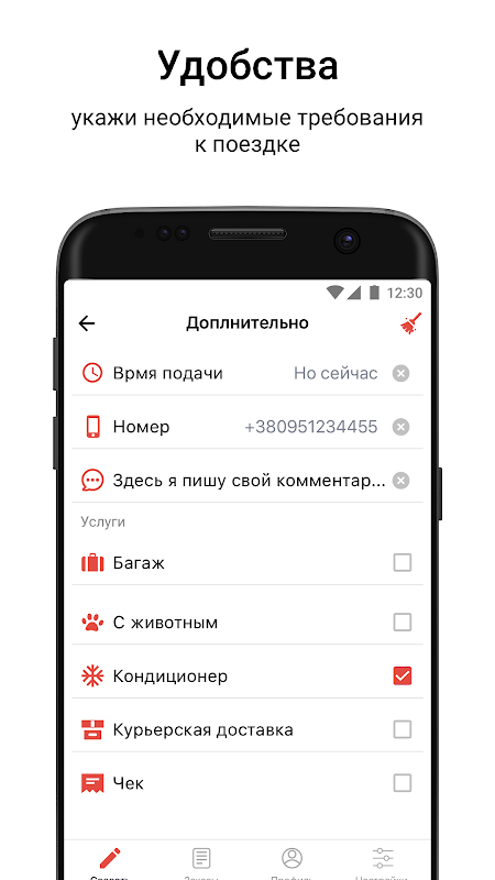 * выбор дополнительных услуг по заказу - возможность указать необходимые для поездки условия, например, перевозка животного