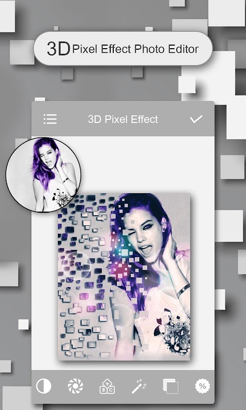 3D pixel effect photo Editor Pics lab Dispersion has everything you wish to create every image amazing. It makes your photos lovely with simple and powerful writing tools. Pic effects is a good picture editor with some beautiful picture effects and varied picture writing choices like layer writing, Lens, Flare, Shape, 3D impact and pixel impact.