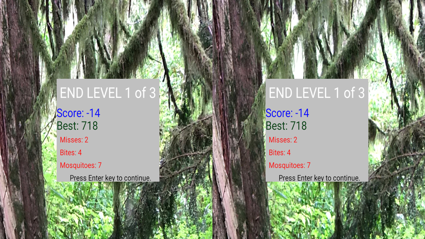 To play, move your head to position the centered reticle pointer over a mosquito and then give it a swat with a magnet pull, screen tap, external USB keyboard ENTER key, or Bluetooth remote controller ENTER key. If you miss, a new mosquito will be added to the swarm, lowering your point score. The game score results from the number of swats minus bites over the shortest time, until you eliminate all mosquitoes on all levels.