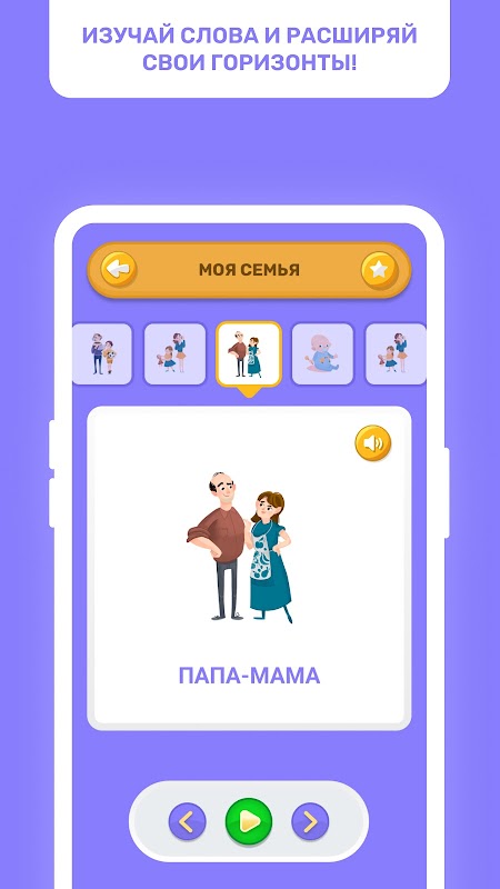 「500個主要單字」是一款包含塔塔爾語、俄語和英語最活躍單字的應用程序,分為「我」、「我的家人」、「我的衣服」、「動物」、「植物」等主題“ 等等。該應用程式有 4 個部分:字母、卡片、卡通提示和遊戲。在“字母表”部分,您可以熟悉三種語言的字母表。在“卡片”部分,您會發現許多按主題劃分的單字。彩色圖片、單字發音和書寫將幫助您快速學習和記住單字。透過「遊戲」部分,您可以輕鬆鞏固所學到的知識。