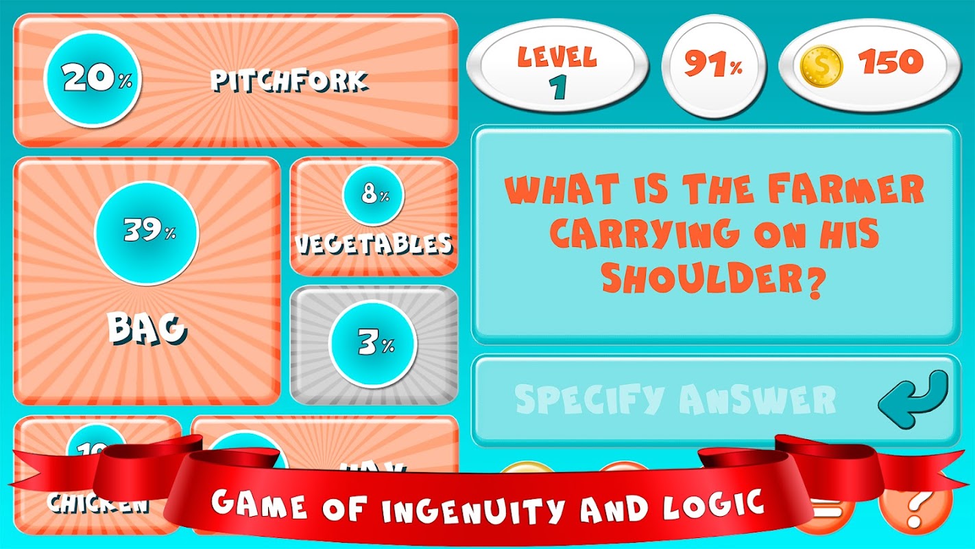 94% 沒有網絡的測驗包含許多令人興奮的級別。對於所有問題,您都需要嘗試輸入其他用戶已輸入的答案。例如,您有一個問題:“浴室裡的一個物體” - 答案將是:牙刷、毛巾、肥皂、洗髮水等。也就是說,您需要輸入的不是正確答案,而是其他人的想法。每個單詞都有自己的百分比,你的任務是獲得該級別所需的分數,然後就被視為通過。 90%不允許你打開另一個級別。在邏輯聯想遊戲中,94%的答案都不是明確的,所以你需要良好的想像力、邏輯性和聰明才智。玩家總是可以進入 5 個開放級別,當通過其中一個級別時,他就可以進入另一個級別。遊戲一開始,腦子裡就給了150個遊戲幣,當通過一關時,你仍然可以賺到50到120個遊戲幣。在線智力遊戲中有提示,可以隨時使用。你可以打開答案換遊戲幣,或者看廣告。