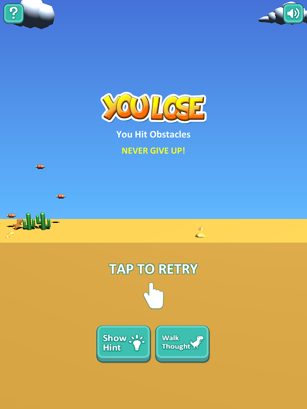 - Level helper, when you get stuck you have 3 options. Show hints: replay the level, this time the game shows you when you should tap. Walk through: learn how to get through the level by watching the t-rex jumping by itself. Skip level: only available when you reach the end of the level, this will bring you straight to the next level, maybe you'll have the better luck.