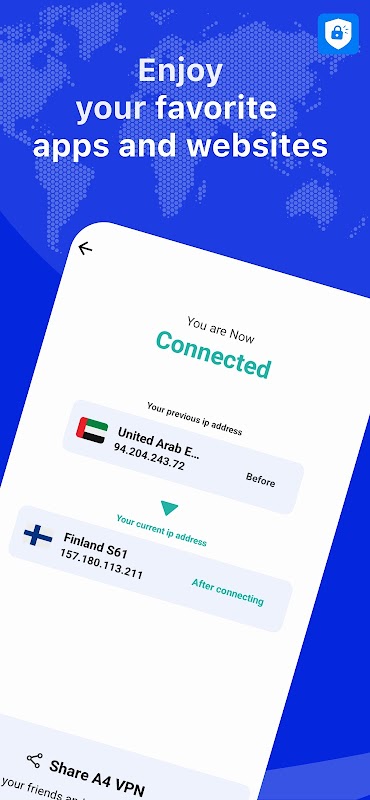 使用 A4 VPN 保護您的隱私和安全。一鍵即可安全瀏覽、解鎖網站並享受快速伺服器。簡單、安全、可靠,滿足您日常網路的使用需求。
