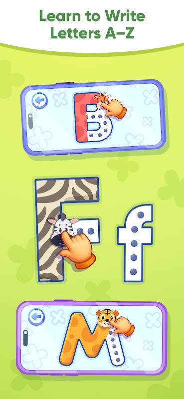 孩子透過視覺、聲音和動作與每個字母互動。這些專為兒童設計的 ABC 學習遊戲經過精心設計,旨在教授以下技能: