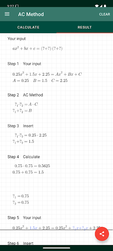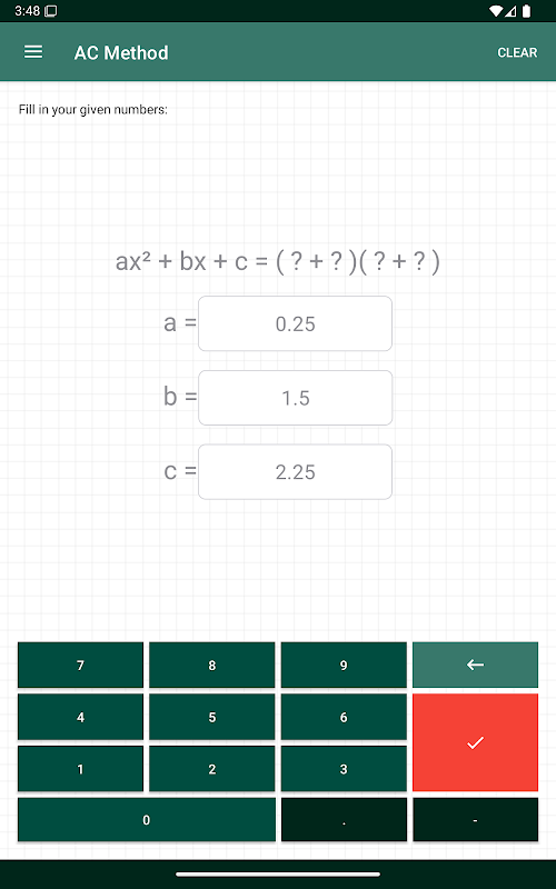 對於因式二次分解,此應用程序使用 AC 方法。為此,只需輸入三個變量。解決方案逐步顯示。所有計算都存儲在歷史記錄中。可以共享最終解決方案。