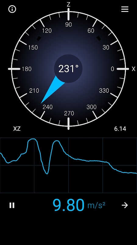 此應用程式向您顯示所有平面中加速度向量的分量,例如大小和方向。加速度向量的主要分量(沿著 X、Y 和 Z 軸)是從行動裝置的感測器連續讀取的。 X、Y 和 Z 軸以及它們形成的平面保持相對於您的設備的方向。我們的應用程式使用快速演算法來組合這些元件,並計算每個平面(XY、XZ 和 ZY)中加速度向量的方向和振幅。例如,如果您直立握住手機,則 XY 平面中的重力加速度向量的傾角為 270 度,大小為 9.81 m/s2。