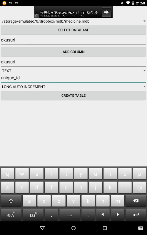 If you choose creating a table, please select the database file (.mdb or .accdb file) and input the name of the tables. You should also input names of columns and select data types of each columns. Push the button [create table ].