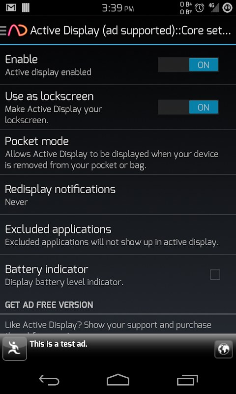 With Active Display, your notifications are available to you right on your screen without any other clutter or distractions. You can easily open up any important notifications or simply dismiss them with a swipe of the screen. Easily view full notifications at the touch of a button or browse through all current notifications with a swipe of your finger. Active Display will turn your screen on and display notifications as they arrive if your device is out in view. If your device has a proximity sensor Active Display will poll it to see if the device is tucked away somewhere and if it is then the display will not be turned on. Want your display to come on the moment you take it out of your pocket? With Active Display that is just one of the many possibilities and easily enabled via Active Display's settings. Become the life of the party when you show your friends your Jedi skills of turning your device on with a wave of your hand. So what are you waiting for? Download Active Display today and put the smart back into smartphone.