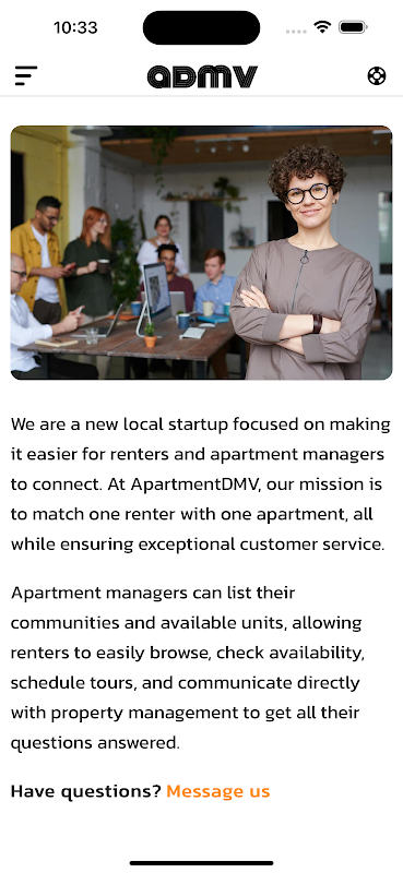 ApartmentDMV 是華盛頓特區、馬裡蘭州和維吉尼亞州地區租戶和物業經理的首選應用程式。無論您是在尋找下一套公寓還是管理可用單元,ApartmentDMV 都能讓流程無縫銜接。租客可以瀏覽清單、檢查可用性、安排旅行,並直接與物業經理或代理商聯繫以獲得即時支援。物業經理可以在一個便利的平台上輕鬆列出他們的社區、更新可用性並與潛在租戶溝通。透過 ApartmentDMV 尋找您的完美住宅或租戶——卓越的服務與 DMV 地區的輕鬆交通相結合。