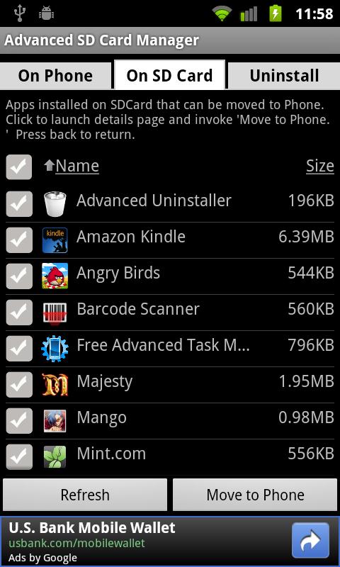 2) move apps from SD Card to phone, and