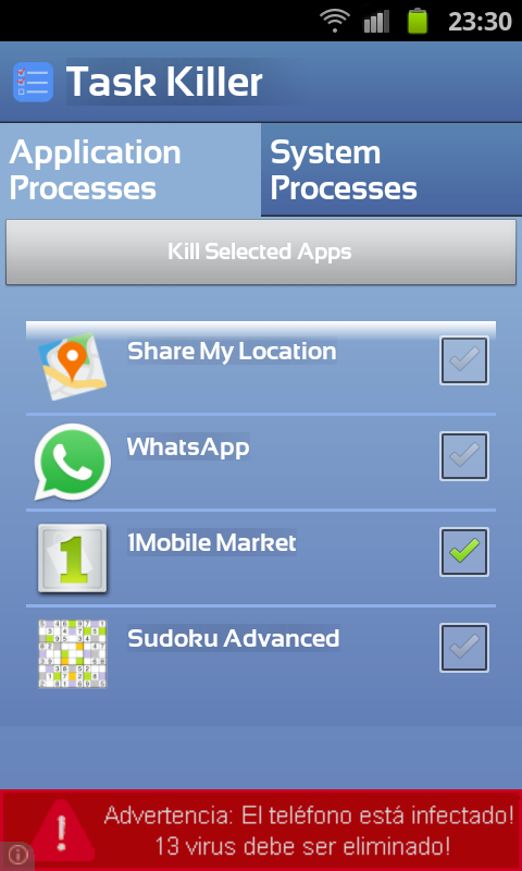 Advanced Task Clean Master is pretty simple. Open this tool and take a look at the running applications list. Check some apps you want to kill (don't kill Advanced Task Clean Master) or some system apps, tap the button 'Kill Selected Apps', Advanced Task Clean Master will kill all applications checked.