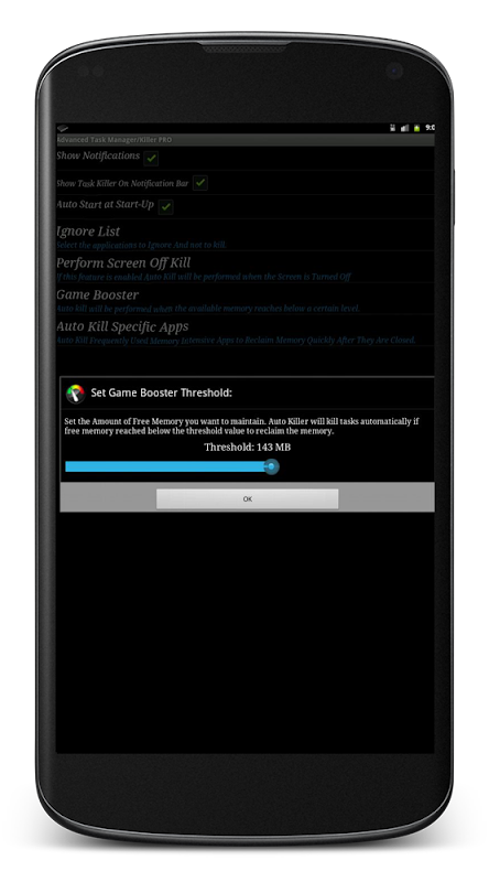 屏幕關閉殺:當你的設備處於停靠狀態或屏幕是關閉的,然後也有一些後台進程不斷殺死這個任務,你可以extain你的電池壽命相當好運行。如果你想要一些應用程序忽略,那麼你可以將它們添加到忽略的設置菜單列表。您也可以設置後該殺將發生的時間。