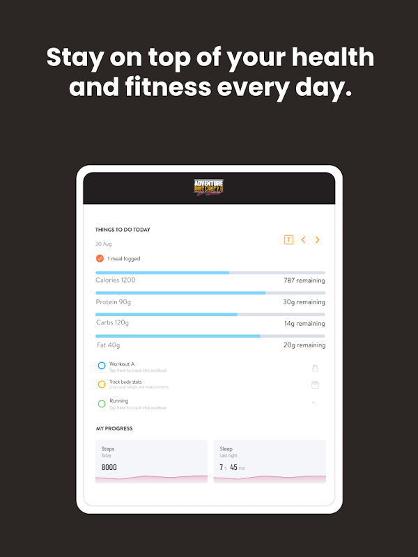 借助 ADVENTURE BOOT CAMP 應用程序,您將可以訪問專門為幫助您實現健身和健康目標而設計的鍛煉計劃!您可以在教練的幫助下追蹤和追蹤您的運動、營養、生活習慣、測量結果和結果。