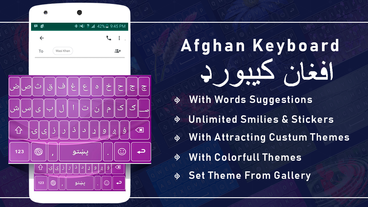 The new Afghan Pashto English Keyboard is the new way to use your default mobile keyboard with multiple colors, beautiful backgrounds, emoji keyboard for mobile and much more. This is best keyboard theme that likely compatible with android keyboard and best app to customize keyboard with new look. Download latest colorful theme keyboard with keyboard wallpaper to give change your phone look into a new way.