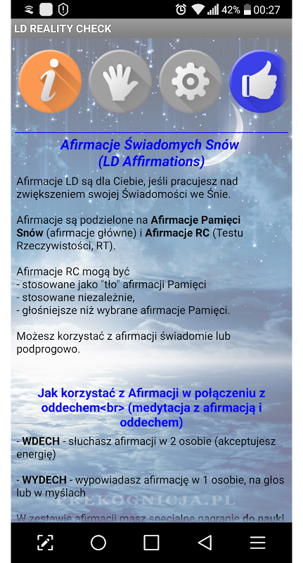 Afirmacje LD (afirmacje świadomych snów + test rzeczywistości) są narzędziem pomagającym zwiększyć poziom Świadomości we Śnie.