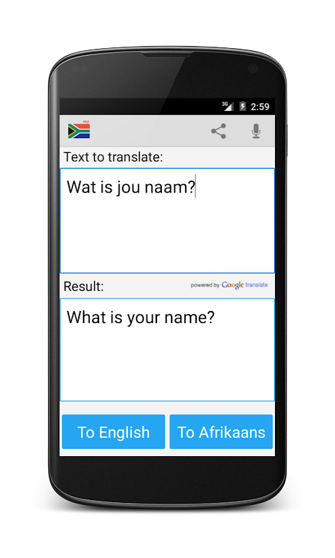 這個免費的應用程序能夠翻譯單詞和文本從英語(或中國)到南非,從南非荷蘭語到英語。為方便,快捷的翻譯,這也就像一本字典非常有用的應用程序!