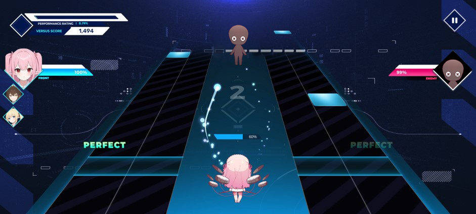 - 使用各種技能擊敗敵方角色並完成歌曲以贏得比賽。