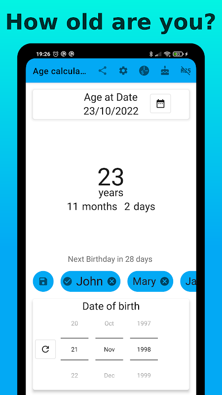 •這個年齡計算器不僅可以幫助您找到您今天的年齡,還可以幫助您找到未來的年齡。