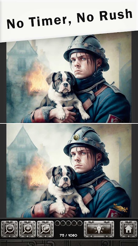 沒有計時器,沒有匆忙; 《人工智慧.藝術 - 找出差異》的特色之一是沒有計時器。我們相信創造一個無壓力的遊戲環境,讓您可以按照自己的步調享受遊戲。沒有匆忙,沒有壓力——只有純粹的放鬆。花點時間欣賞圖像之美,並毫不匆忙地找到所有差異。
