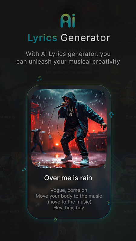 無論您是要克服寫作障礙、嘗試新風格,還是只是想增強您的抒情創造力,我們的應用程式都能提供無縫體驗。透過先進的人工智慧功能,您只需輕按幾下即可為民謠、搖滾歌曲、饒舌詩句等創建歌詞。