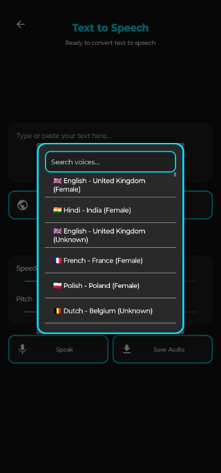 ✔ 多種語音選項 - 男聲、女聲和不同的音調。