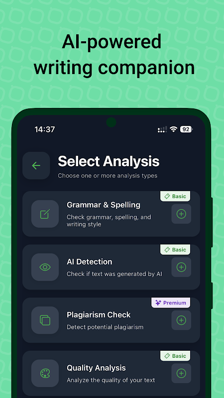 根據您的需求和使用限制選擇要執行的分析。獲得詳細的互動式結果,突出顯示文字中的特定問題。進階功能包括 AI 支援的修復,例如改寫抄襲內容或人性化 AI 編寫的文字。