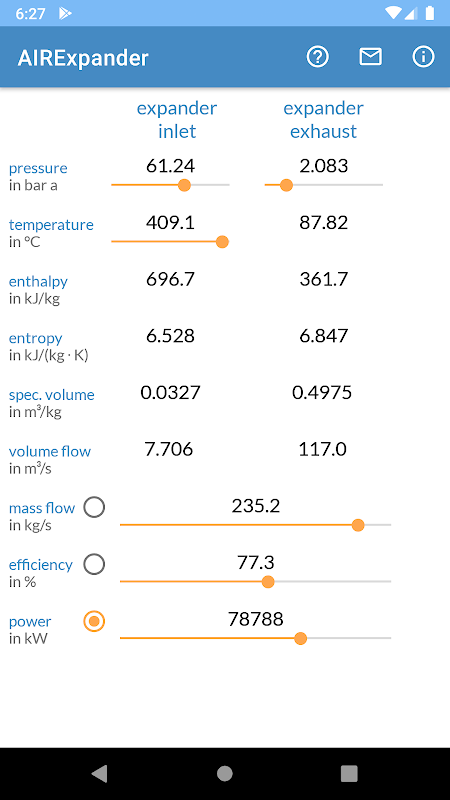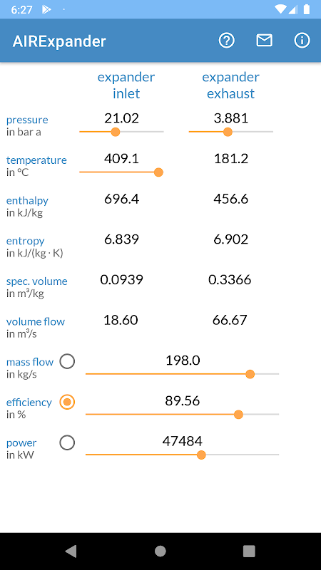 您可以通過應用程序滑塊輕鬆編輯邊界條件。對於每次計算,入口壓力,入口溫度和排氣壓力都是必需的。可以計算質量流量,效率或功率這三個參數之一。您可以在這三個參數之間切換。