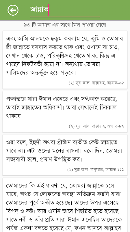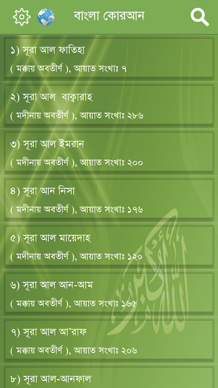 在這種應用中,古蘭經的所有古蘭經(114)孟加拉語的錢已被添加。每章一直ayatabhittika孟加拉錢。直接從列表中會出現選擇蘇拉特的任何詩句的含義孟加拉語。