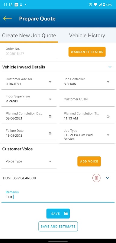 該應用程序具有捕獲客戶語音和查看車輛歷史記錄的功能。它還可以通過電子郵件或短信立即向客戶發送報價/維修估算。此應用程序主要用於 SA。 SA 將可以根據活動的 DBM 用戶 ID 訪問該應用程序。條款和條件適用,版權為 Ashok Leyland。