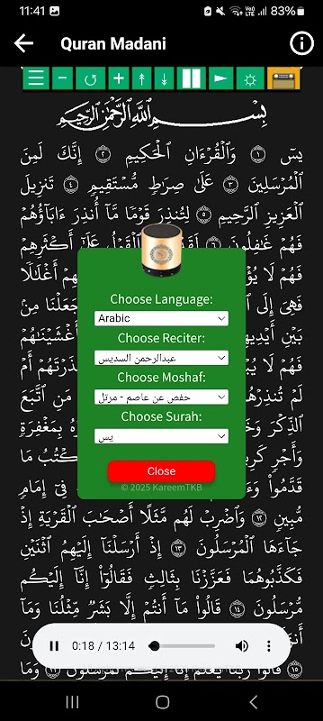 除 Sudais 外,還有 Al‑Afasy、Al‑Ajmi、Mishary 等著名朗誦者,並支援 Hafs、Warsh、Qaloon、Al‑Duri、Moshaf Al‑Muallim 等不同版本。