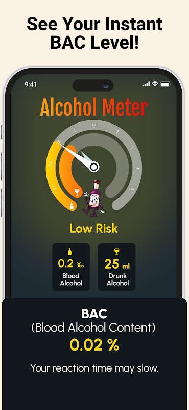 促进负责的饮酒: 通过提供准确的BAC估算和提醒,应用程序帮助您避免过量饮酒,有益于肝脏健康和整体福祉。