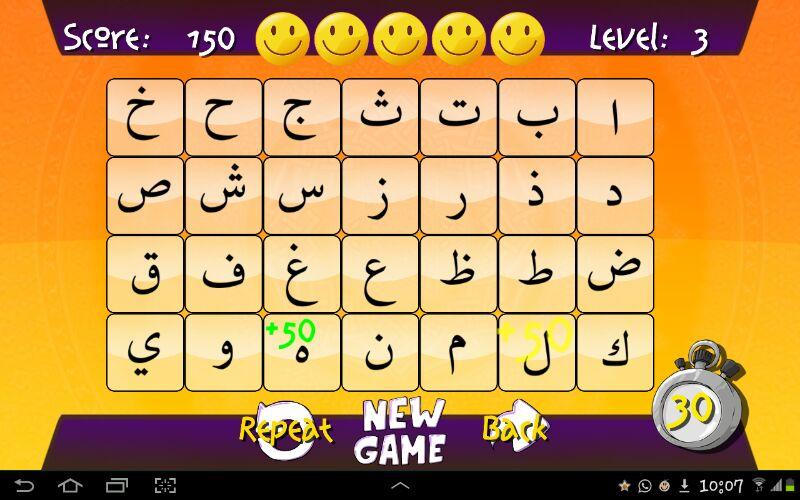 The word to catch is represented by the sound of the Arabic alphabet and giving with the splash letters. The player needs to repeat the sequence with the same orders to get points of mark. If the player guessing a letter that does not occur in the sequence, the smiley face will decrease one by one until there is no smiley face which means the users has exceed game over.