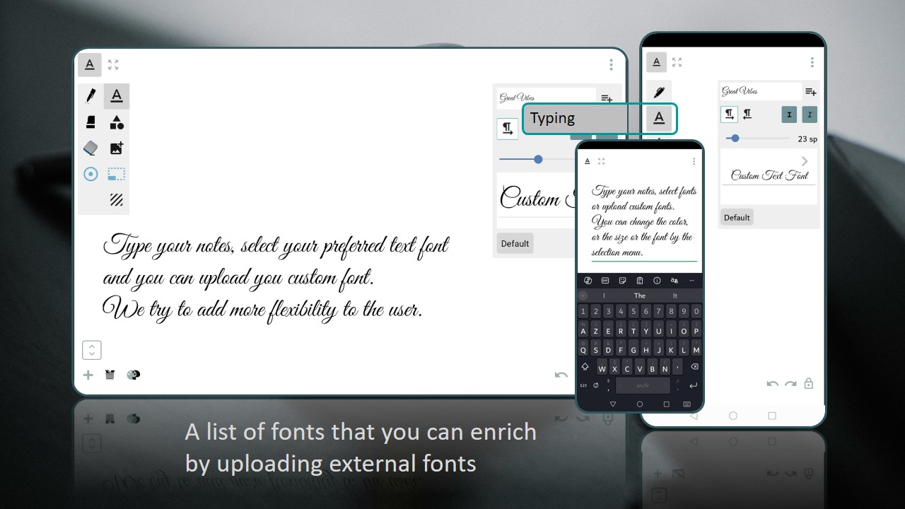 Alkalem 是一個具有不同工具的文件編輯器。 在這裡您可以找到帶有一些圖形效果的經典鋼筆。如果您喜歡輸入段落,您可以在此處找到令人驚嘆的字體列表,您可以透過上傳應用程式中註明的外部字體來豐富這些字體。你可以改變背景,加入一些幾何形狀,加入圖像...