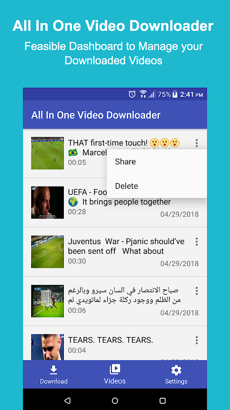 You can download any Facebook, Instagram and Twitter video just by copy the link and paste it into the app.