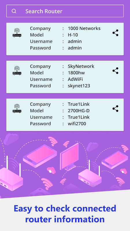 - All surrounding router list is provided with Company name, Model, Username, Password.