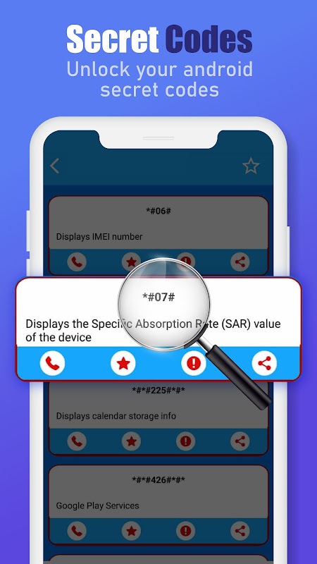 Secret Codes App 为您提供所有主要手机品牌的 USSD 代码和 Hack 代码。 USSD 代码或“秘密代码”只是用于解锁智能手机隐藏功能的代码。 智能移动设备提供了几个密码。 当这些代码从手机上手动输入时,它们会显示一些关于您设备的简单统计数据。
