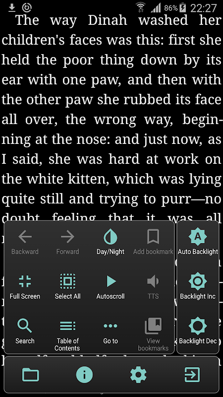 您可以使用外部詞典翻譯單詞和句子。您有機會糾正fb2和txt文件中的錯別字。該應用程序可以安排20種語言的連字符。日/夜配置文件可在一天中的任何時間舒適地閱讀。自定義字體設置。自定義顏色設置。單頁和兩頁模式,橫向自動切換到兩頁模式。 OpenGL分頁動畫。自動滾動“波浪”。文本中的導航:按百分比,按頁面,至文本的開頭/結尾,下一章/上一章。 9個輕敲區,分別用於短按和長按,手勢,兩根手指的手勢,按“捏”調整文本的大小,以分配按鈕的操作。能夠保持屏幕背光(最多不活動10分鐘)。通過網絡或文件系統同步讀取位置。
