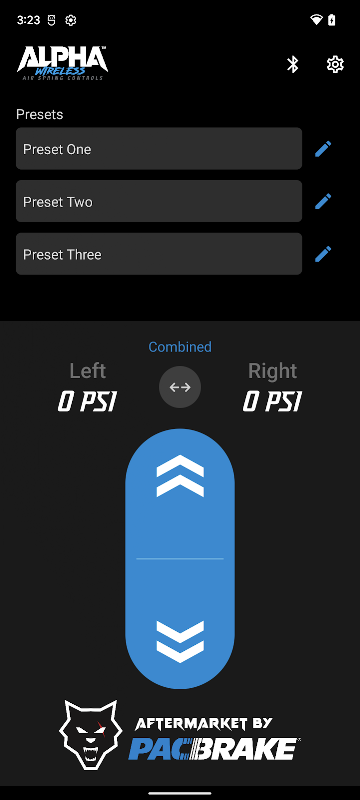這個易於使用的應用程序讀取每個空氣彈簧內的實時壓力反饋。此外,它具有三個按鈕,可讓您保存預設,以便您可以快速達到所需的空氣彈簧壓力。 AMP Wireless Controls 應用程序可與 Pacbrake 的 AMP Wireless Air Spring Controls(套件編號 HP10316)配合使用。