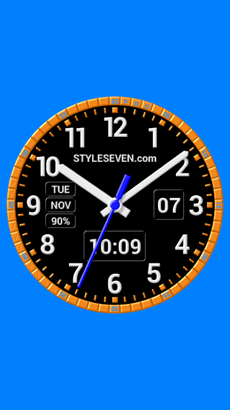 * Full color control of all clock elements: ring, dial, markers, numbers, text, hands and backrgound;