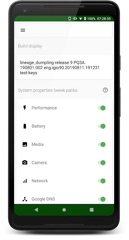 performance, battery, media, camera, network and dns