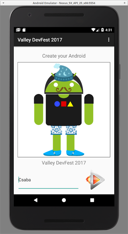 這是一個免費的開源項目。請在https://github.com/gdgfresno/androidify-yourself/issues提交任何問題。 Valley Devfest 2017會議參與者可以通過選擇頭部/身體/腿部配置並命名角色來設計其化身。提交後,角色將與其他參與者的角色一起出現在會議網站的Androidify頁面上(請參閱https://vdf2017-3a9f6.firebaseapp.com/participants/或單擊應用程序中的網站按鈕),以使其他參與者參與其中並賦予參與者權力。