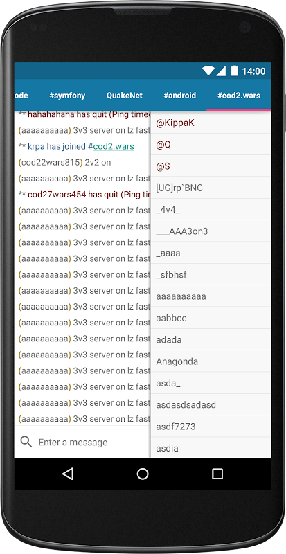 AndroIRC是一個完整的IRC客戶端(多服務器,SSL,NickServ,SASL,魚,DCC)