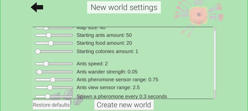 該遊戲模擬螞蟻使用信息素逼真地尋找食物!使用兩種類型的信息素,他們可以找到最佳的食物路徑,避開障礙物!