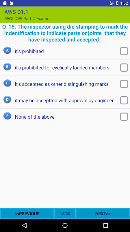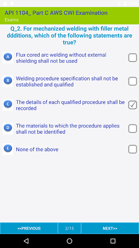 This Free version includes 15 practice and 15 exam questions to show you the general view of the app. The Full Exams version includes more than 600 exam questions that cover the whole sections of API 1104 open- book exam belong AWS CWI Part C Examination.