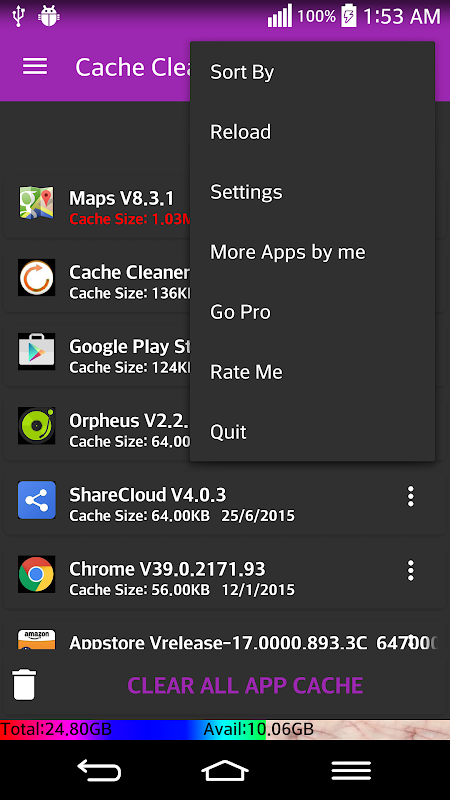 1tap cache clean App cache cleaner is a quick tool for clearing application cached files.It is the fastest cache cleaner for android. One Tap to clean all cached files for getting more available space. This tool can be used to free a lot of internal storage on your phone. It is an app which is crucial to anyone who has memory management issues. If you running out of application storage, you now can get more available storage space by clearing apps created cache files.