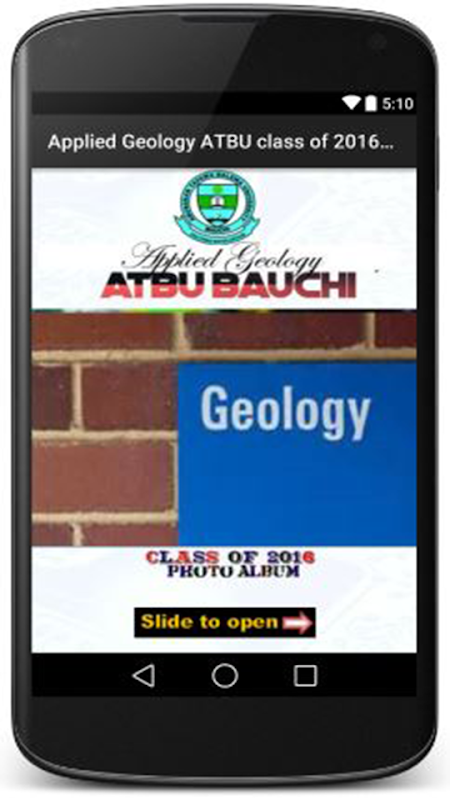 Applied Geology ATBU class Of 2016 Photo Album Mobile Application is a photo album application that contains the full details of every class member of Applied Geology class of 2016 Abubakar Tafawa Balewa University Bauchi. It contains class members Full Name, Nickname, Phone number, Home Address, State of Origin, Favorite quote and words of encouragement.