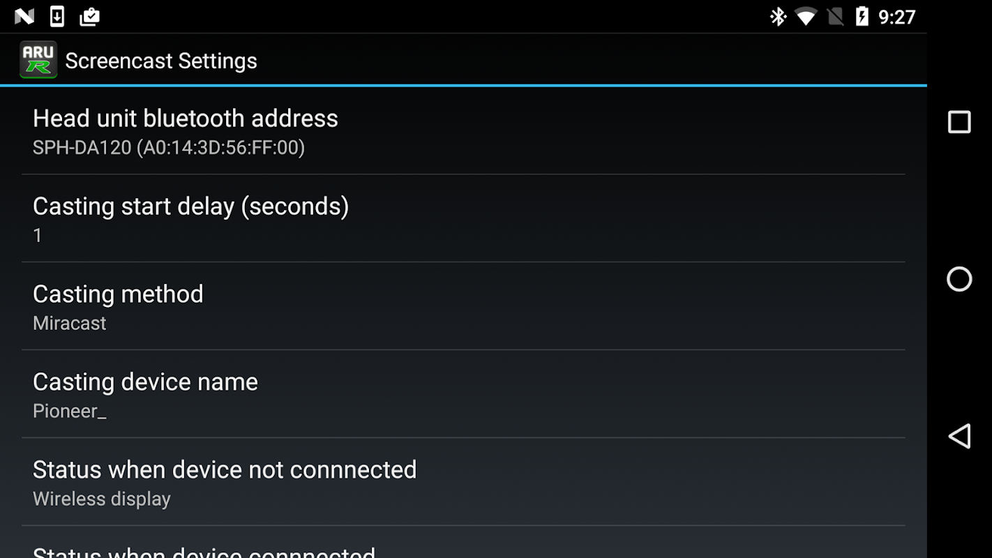 AppRadio 模式要求您的設備連接到主機的 HDMI 輸入。根據設備的不同,這可以通過 MHL / Slimport / Miracast / Chromecast 適配器完成。本應用支持自動連接無線投屏設備。由於 Google API 不直接支持這一點,它是通過手機的 GUI 完成的。請注意,只能使用手機的內置截屏功能。